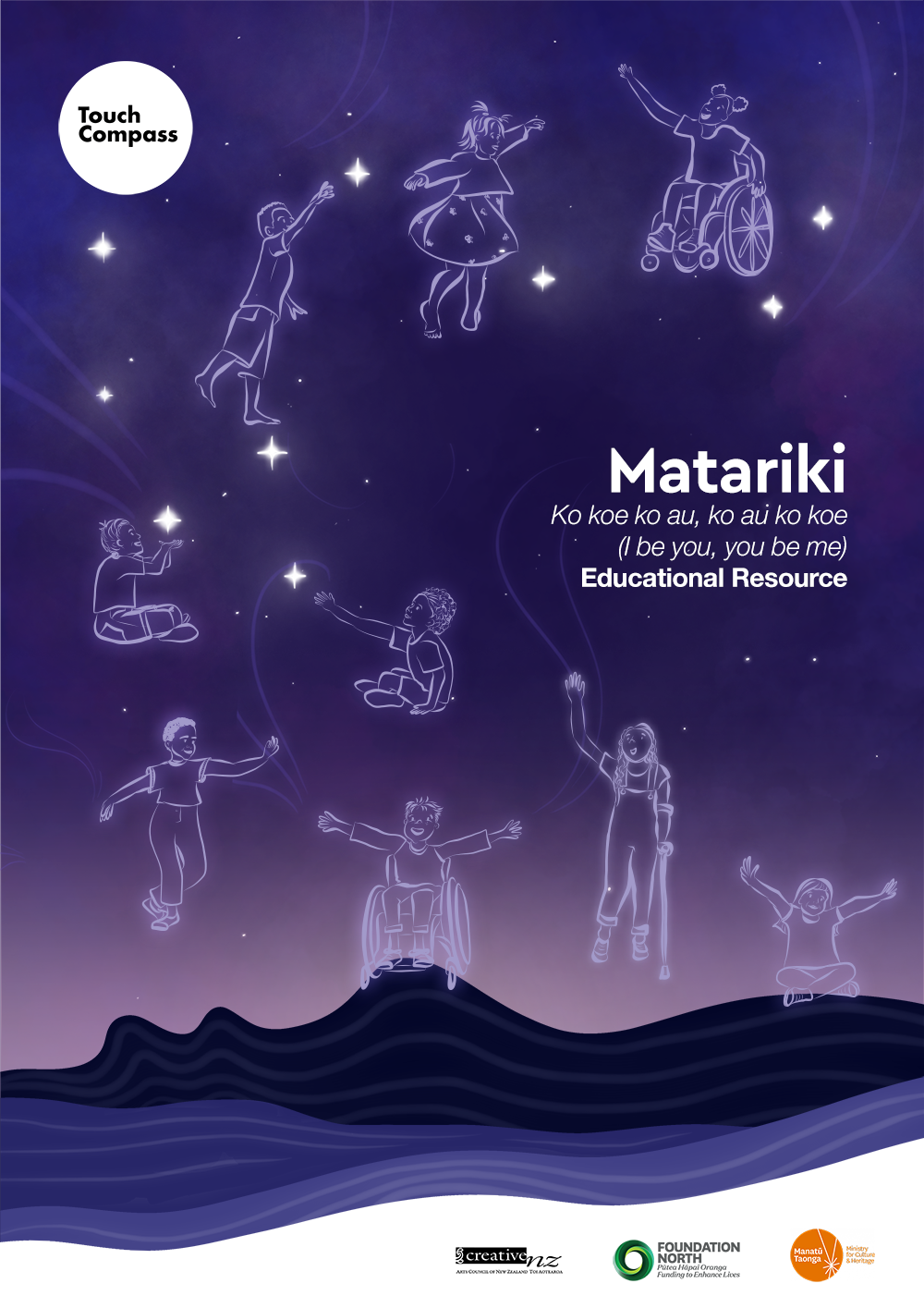 Touch Compass is pleased to present and deliver to you the educational resource Matariki : Ko koe ko au, ko au ko koe (I be you, you be me). It has taken months of intensive collaborative work to create this special offering that reaches your hands today, thanks to the collective work and effort of all our whānau, artists, allies, staff members, creatives and tutors with lived and non-lived experience of disability.